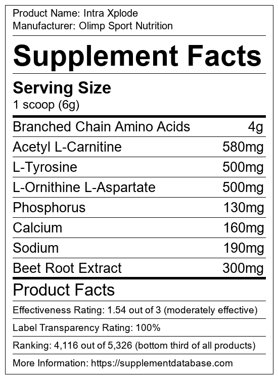 Intra Xplode is an intra-workout supplement manufactured by Olimp Sport Nutrition. It ranks 296 out of 339 intra-workout supplements and earned an overall thumbs-down recommendation based on seven factors including nutrition label transparency, ingredients, dosing, claims, research rating, and ranking.