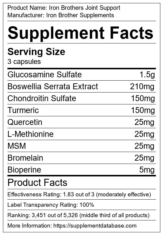 Iron Brothers Joint Support is a joint supplement manufactured by Iron Brother Supplements. It ranks 78 out of 99 joint supplements and earned an overall thumbs-down recommendation based on seven factors including nutrition label transparency, ingredients, dosing, claims, research rating, and ranking.