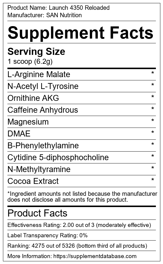 Launch 4350 Reloaded is a pre-workout supplement manufactured by SAN Nutrition. It ranks 1,727 out of 1,898 pre-workout supplements and earned an overall thumbs-down recommendation based on seven factors including nutrition label transparency, ingredients, dosing, claims, research rating, and ranking.