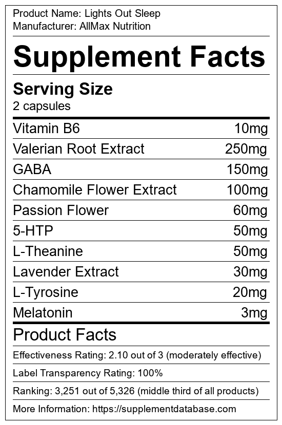 Lights Out Sleep is a sleep aid manufactured by AllMax Nutrition. It ranks 165 out of 215 sleep aids and earned an overall thumbs-down recommendation based on seven factors including nutrition label transparency, ingredients, dosing, claims, research rating, and ranking.