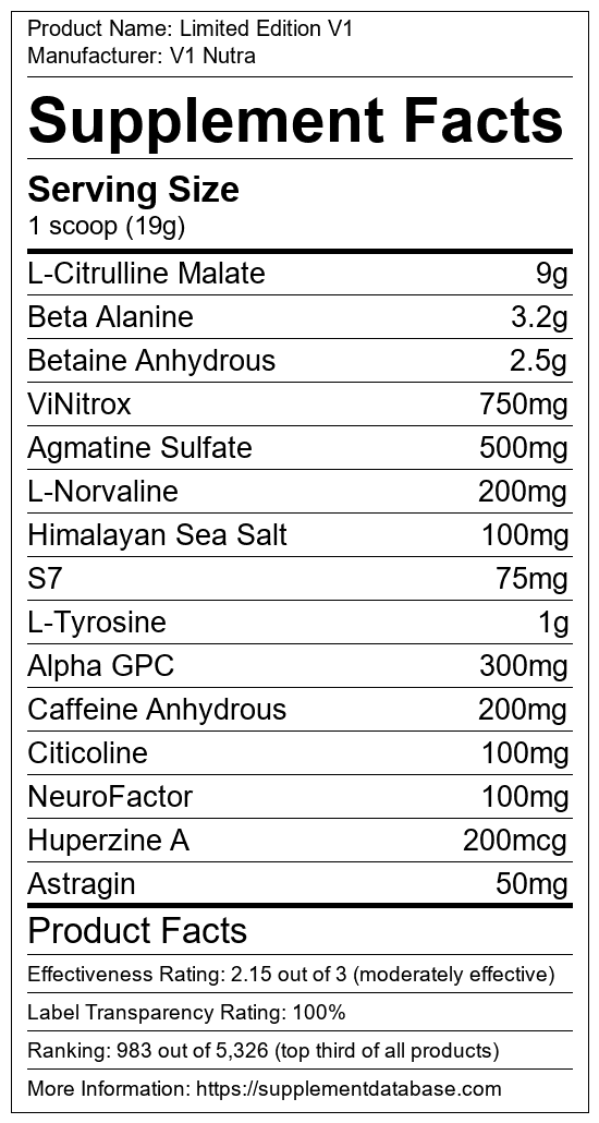 Limited Edition V1 is a pre-workout supplement manufactured by V1 Nutra. It ranks 436 out of 1,898 pre-workout supplements and earned an overall thumbs-up recommendation based on seven factors including nutrition label transparency, ingredients, dosing, claims, research rating, and ranking.