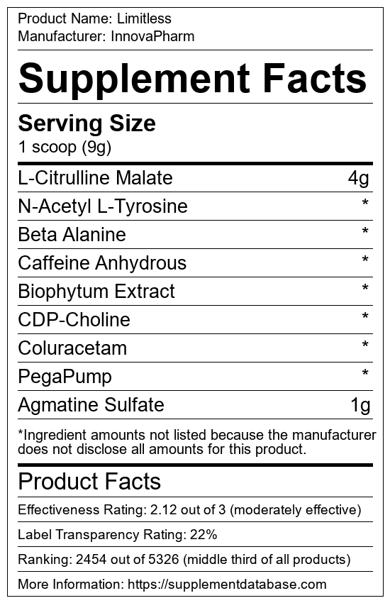 Limitless is a pre-workout supplement manufactured by InnovaPharm. It ranks 1,139 out of 1,898 pre-workout supplements and earned an overall thumbs-down recommendation based on seven factors including nutrition label transparency, ingredients, dosing, claims, research rating, and ranking.