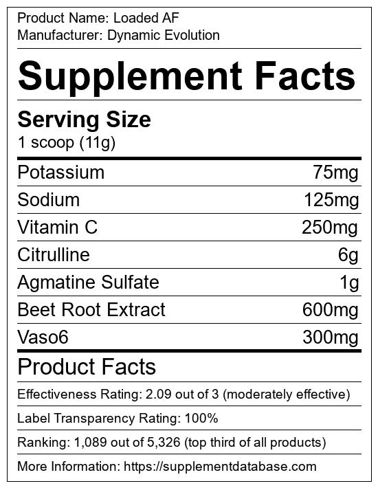 Loaded AF is a pump supplement manufactured by Dynamic Evolution. It ranks 109 out of 322 pump supplements and earned an overall thumbs-up recommendation based on seven factors including nutrition label transparency, ingredients, dosing, claims, research rating, and ranking.
