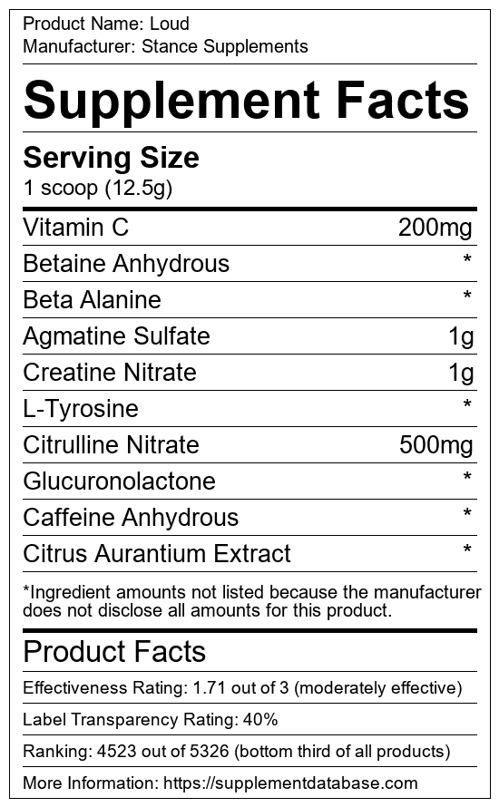 Loud is a pre-workout supplement manufactured by Stance Supplements. It ranks 1,797 out of 1,898 pre-workout supplements and earned an overall thumbs-down recommendation based on seven factors including nutrition label transparency, ingredients, dosing, claims, research rating, and ranking.