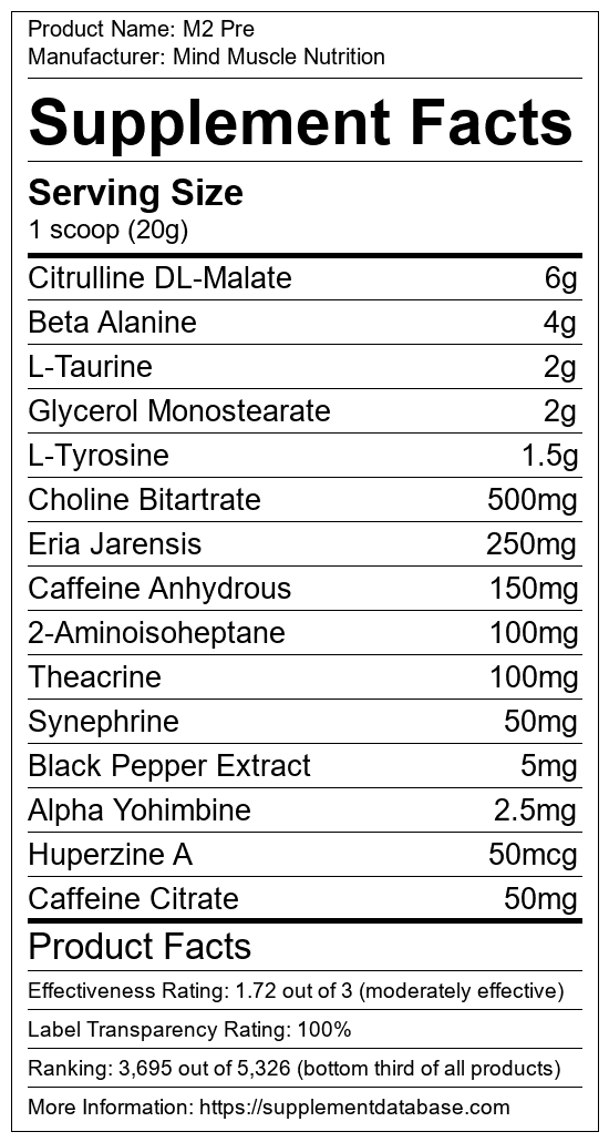 M2 Pre is a pre-workout supplement manufactured by Mind Muscle Nutrition. It ranks 1,490 out of 1,898 pre-workout supplements and earned an overall thumbs-down recommendation based on seven factors including nutrition label transparency, ingredients, dosing, claims, research rating, and ranking.