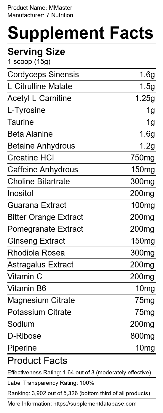 MMaster is a pre-workout supplement manufactured by 7 Nutrition. It ranks 1,605 out of 1,898 pre-workout supplements and earned an overall thumbs-down recommendation based on seven factors including nutrition label transparency, ingredients, dosing, claims, research rating, and ranking.