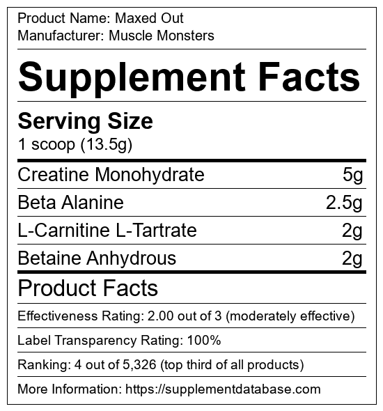 Maxed Out is a post-workout supplement manufactured by Muscle Monsters. It ranks 2 out of 515 post-workout supplements and earned an overall thumbs-up recommendation based on seven factors including nutrition label transparency, ingredients, dosing, claims, research rating, and ranking.