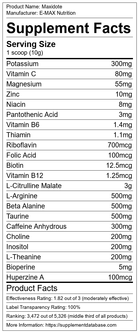 Maxidote is a pre-workout supplement manufactured by E-MAX Nutrition. It ranks 1,354 out of 1,898 pre-workout supplements and earned an overall thumbs-down recommendation based on seven factors including nutrition label transparency, ingredients, dosing, claims, research rating, and ranking.