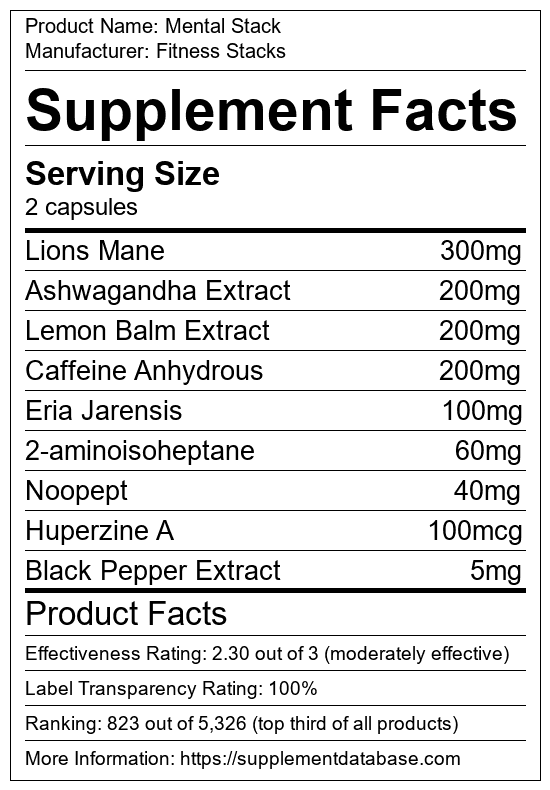 Mental Stack is a cognitive enhancement supplement manufactured by Fitness Stacks. It ranks 28 out of 173 cognitive enhancement supplements and earned an overall thumbs-up recommendation based on seven factors including nutrition label transparency, ingredients, dosing, claims, research rating, and ranking.