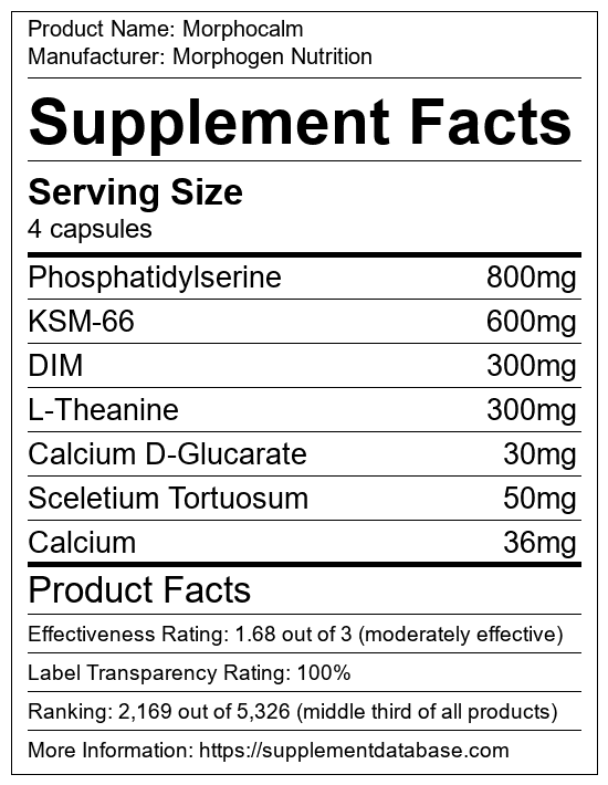 Morphocalm is a mood enhancing supplement manufactured by Morphogen Nutrition. It ranks 23 out of 43 mood enhancing supplements and earned an overall thumbs-up recommendation based on seven factors including nutrition label transparency, ingredients, dosing, claims, research rating, and ranking.