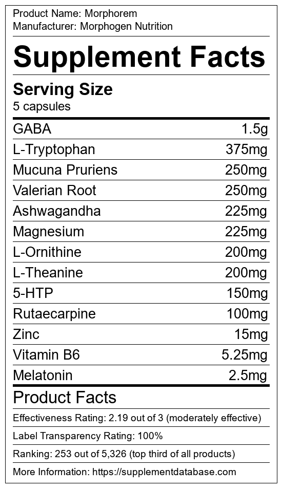 Morphorem is a sleep aid manufactured by Morphogen Nutrition. It ranks 23 out of 215 sleep aids and earned an overall thumbs-up recommendation based on seven factors including nutrition label transparency, ingredients, dosing, claims, research rating, and ranking.