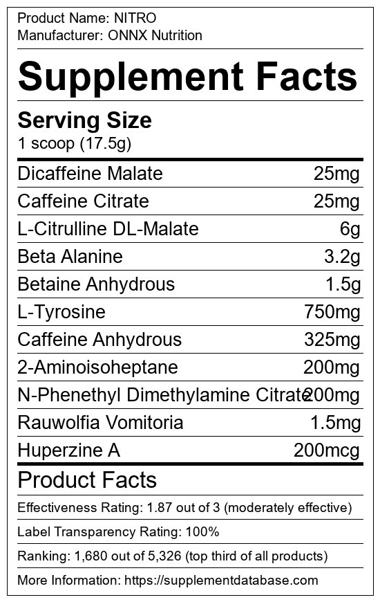 NITRO is a pre-workout supplement manufactured by ONNX Nutrition. It ranks 749 out of 1,898 pre-workout supplements and earned an overall thumbs-up recommendation based on seven factors including nutrition label transparency, ingredients, dosing, claims, research rating, and ranking.