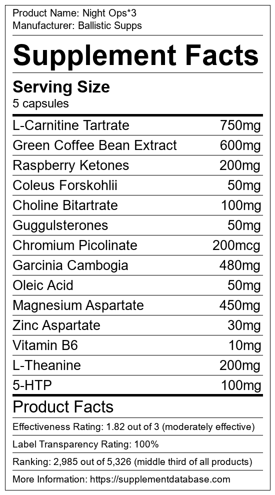 Night Ops is a fat burning supplement manufactured by Ballistic Supps. It ranks 391 out of 719 fat burning supplements and earned an overall thumbs-down recommendation based on seven factors including nutrition label transparency, ingredients, dosing, claims, research rating, and ranking.