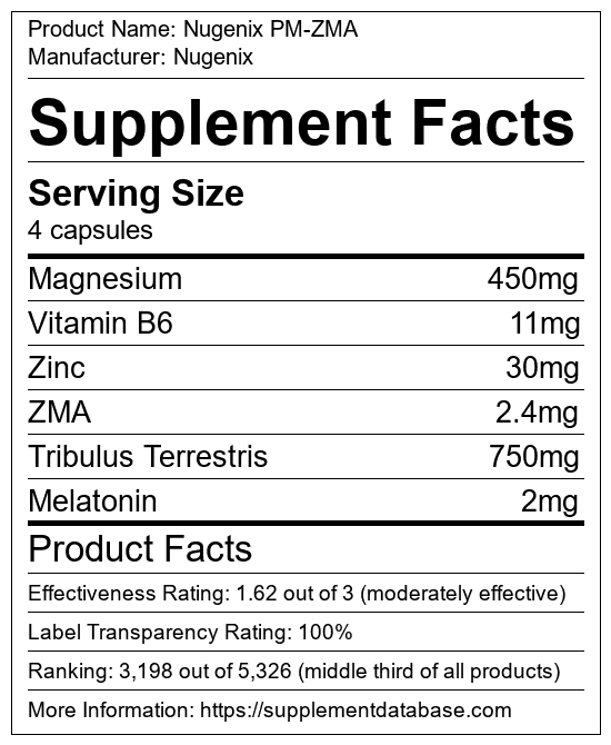 Nugenix PM-ZMA is a testosterone booster manufactured by Nugenix. It ranks 190 out of 321 testosterone boosters and earned an overall thumbs-down recommendation based on seven factors including nutrition label transparency, ingredients, dosing, claims, research rating, and ranking.