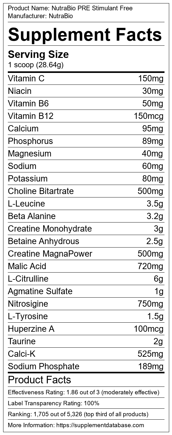 NutraBio PRE Stimulant Free earned a thumbs-up in this category because its effectiveness rating is 1.86. A product's effectiveness rating must be at least 1.5 to receive a thumbs-up in this area. This effectiveness rating means NutraBio PRE Stimulant Free is made up of a mix of both high and low-quality ingredients and may lead to some positive results.