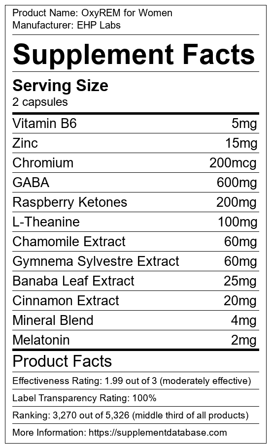 OxyREM for Women is a sleep aid manufactured by EHP Labs. It ranks 184 out of 215 sleep aids and earned an overall thumbs-down recommendation based on seven factors including nutrition label transparency, ingredients, dosing, claims, research rating, and ranking.