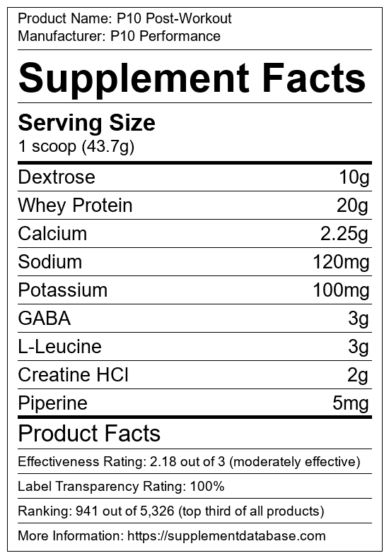 P10 Post-Workout is a post-workout supplement manufactured by P10 Performance. It ranks 96 out of 515 post-workout supplements and earned an overall thumbs-up recommendation based on seven factors including nutrition label transparency, ingredients, dosing, claims, research rating, and ranking.