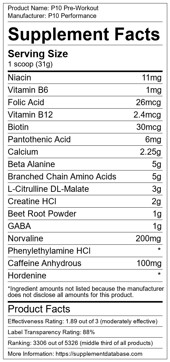 P10 Pre-Workout is a pre-workout supplement manufactured by P10 Performance. It ranks 1,277 out of 1,898 pre-workout supplements and earned an overall thumbs-down recommendation based on seven factors including nutrition label transparency, ingredients, dosing, claims, research rating, and ranking.