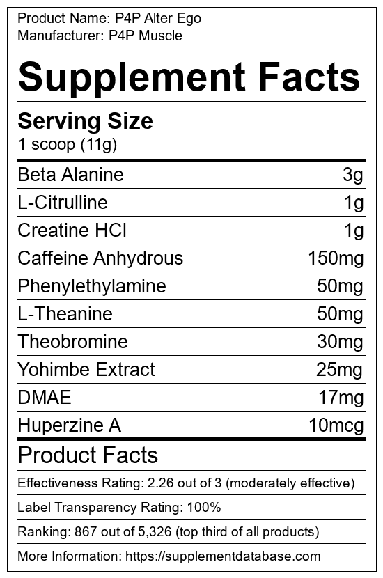 P4P Alter Ego is a pre-workout supplement manufactured by P4P Muscle. It ranks 401 out of 1,898 pre-workout supplements and earned an overall thumbs-up recommendation based on seven factors including nutrition label transparency, ingredients, dosing, claims, research rating, and ranking.