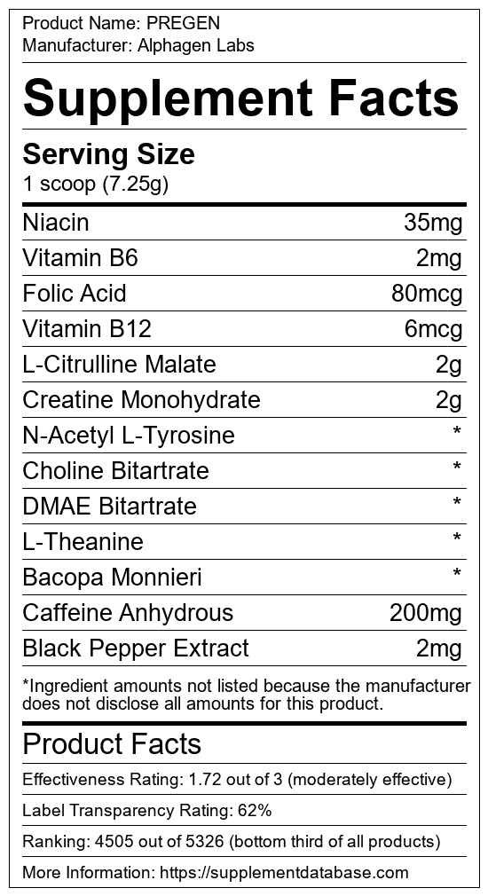 PREGEN is a pre-workout supplement manufactured by Alphagen Labs. It ranks 1,783 out of 1,898 pre-workout supplements and earned an overall thumbs-down recommendation based on seven factors including nutrition label transparency, ingredients, dosing, claims, research rating, and ranking.
