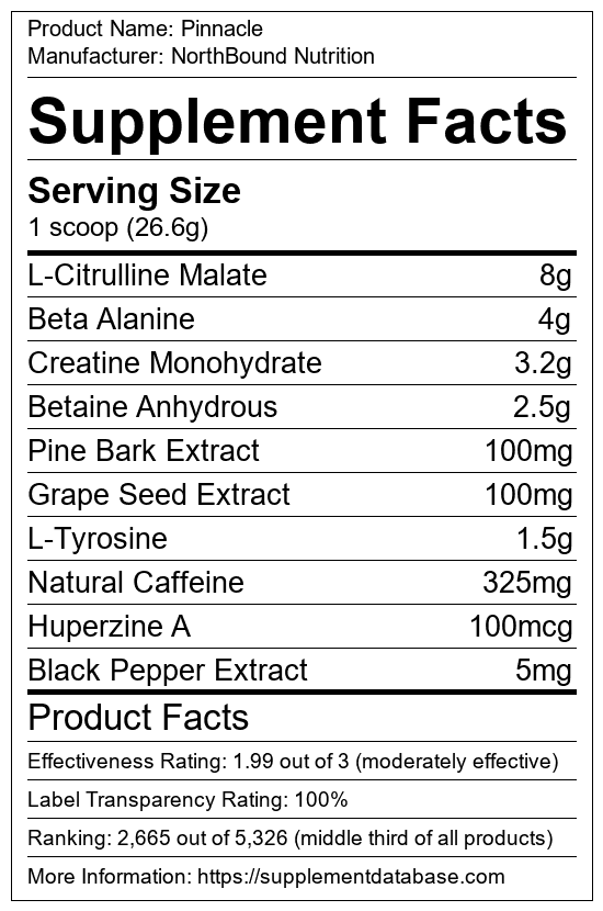 Pinnacle is a pre-workout supplement manufactured by NorthBound Nutrition. It ranks 1,197 out of 1,898 pre-workout supplements and earned an overall thumbs-down recommendation based on seven factors including nutrition label transparency, ingredients, dosing, claims, research rating, and ranking.
