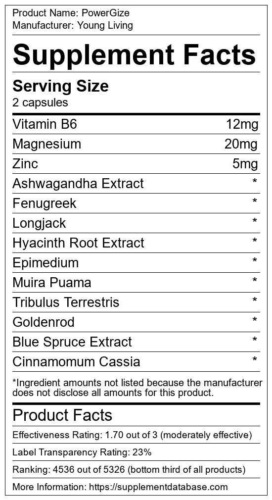 PowerGize is a pre-workout supplement manufactured by Young Living. It ranks 1,803 out of 1,898 pre-workout supplements and earned an overall thumbs-down recommendation based on seven factors including nutrition label transparency, ingredients, dosing, claims, research rating, and ranking.