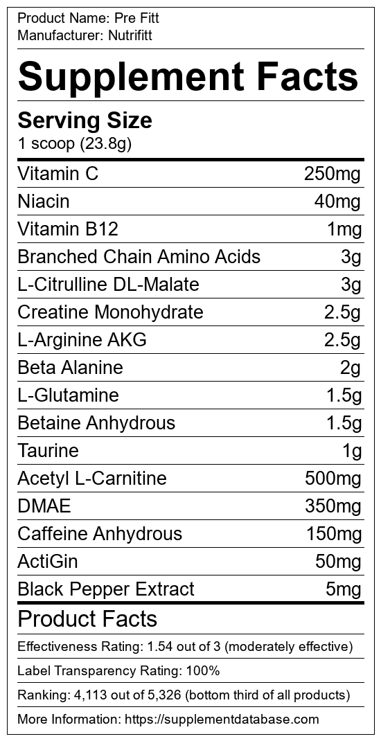 Pre Fitt is a pre-workout supplement manufactured by Nutrifitt. It ranks 1,682 out of 1,898 pre-workout supplements and earned an overall thumbs-down recommendation based on seven factors including nutrition label transparency, ingredients, dosing, claims, research rating, and ranking.
