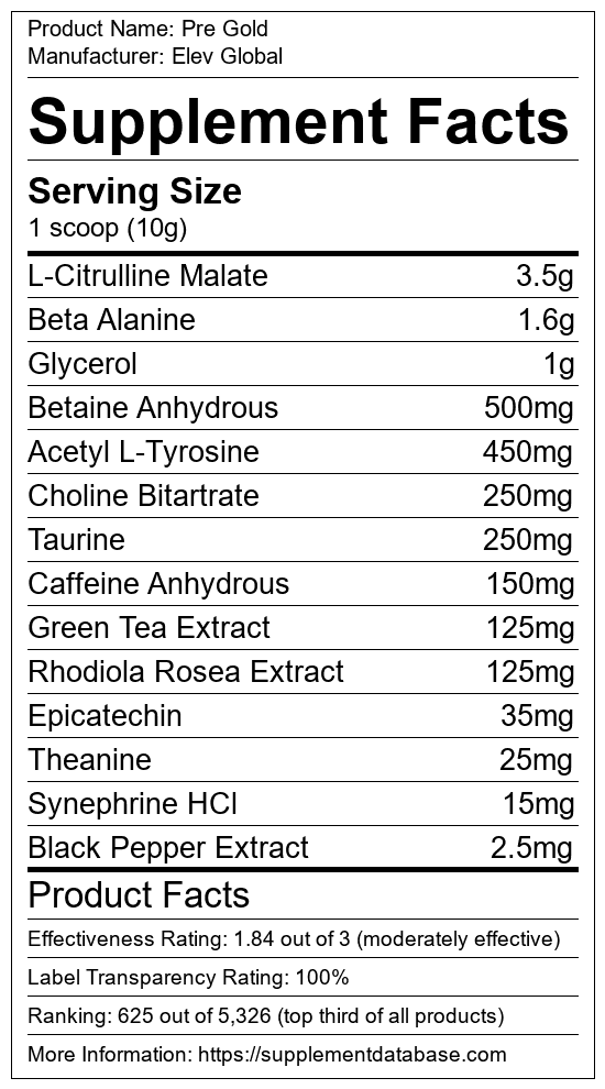 Pre Gold is a pre-workout supplement manufactured by Elev Global. It ranks 297 out of 1,898 pre-workout supplements and earned an overall thumbs-up recommendation based on seven factors including nutrition label transparency, ingredients, dosing, claims, research rating, and ranking.