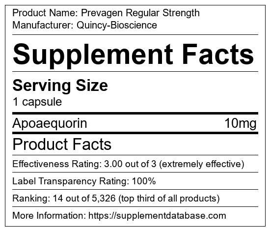 Prevagen Regular Strength is a memory enhancing supplement manufactured by Quincy-Bioscience. It ranks 1 out of 4 memory enhancing supplements and earned an overall thumbs-up recommendation based on seven factors including nutrition label transparency, ingredients, dosing, claims, research rating, and ranking.