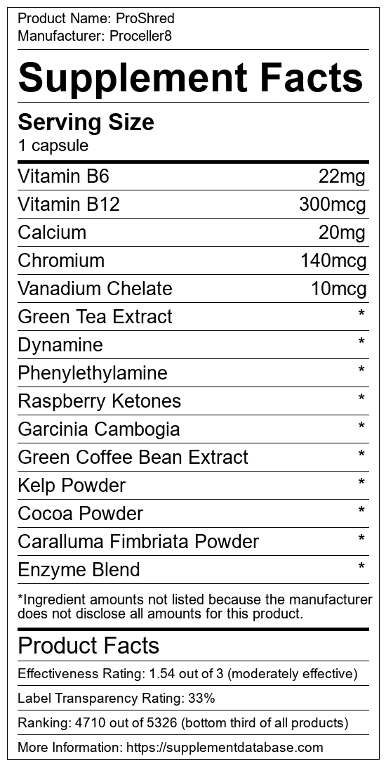 ProShred is a fat burning supplement manufactured by Proceller8. It ranks 693 out of 719 fat burning supplements and earned an overall thumbs-down recommendation based on seven factors including nutrition label transparency, ingredients, dosing, claims, research rating, and ranking.
