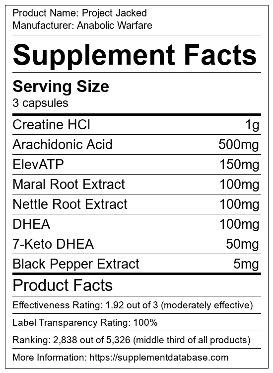 Project Jacked earned a thumbs-up in this category because its effectiveness rating is 1.92. A product's effectiveness rating must be at least 1.5 to receive a thumbs-up in this area. This effectiveness rating means Project Jacked is made up of a mix of both high and low-quality ingredients and may lead to some positive results.