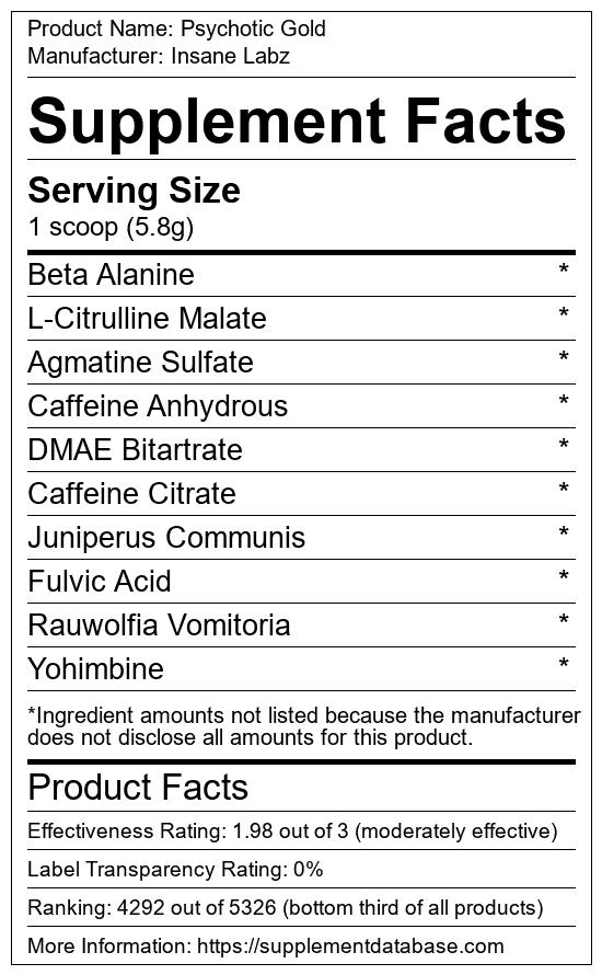 Psychotic Gold does not list ingredient amounts on its label. This makes it impossible to analyze ingredient dosing.