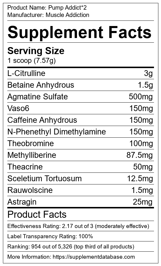 Pump Addict is a pump supplement manufactured by Muscle Addiction. It ranks 97 out of 322 pump supplements and earned an overall thumbs-up recommendation based on seven factors including nutrition label transparency, ingredients, dosing, claims, research rating, and ranking.