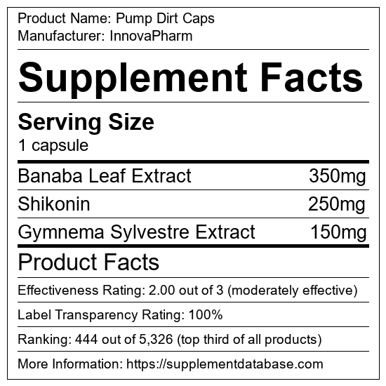 Pump Dirt Caps is a pump supplement manufactured by InnovaPharm. It ranks 53 out of 322 pump supplements and earned an overall thumbs-up recommendation based on seven factors including nutrition label transparency, ingredients, dosing, claims, research rating, and ranking.