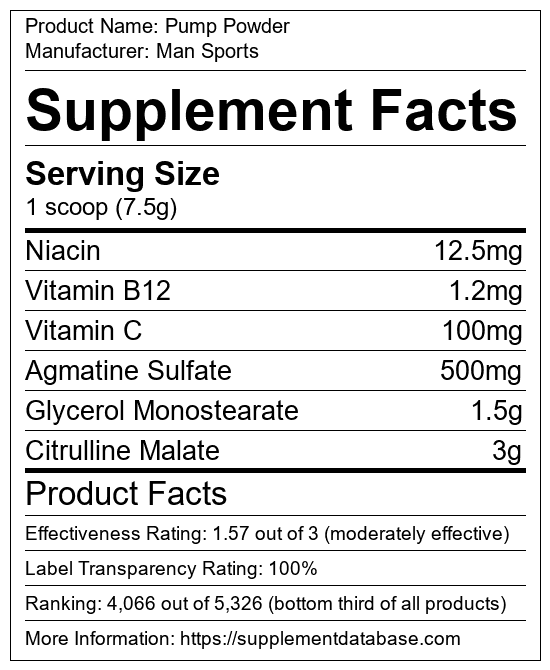 Pump Powder is a pump supplement manufactured by Man Sports. It ranks 277 out of 322 pump supplements and earned an overall thumbs-down recommendation based on seven factors including nutrition label transparency, ingredients, dosing, claims, research rating, and ranking.