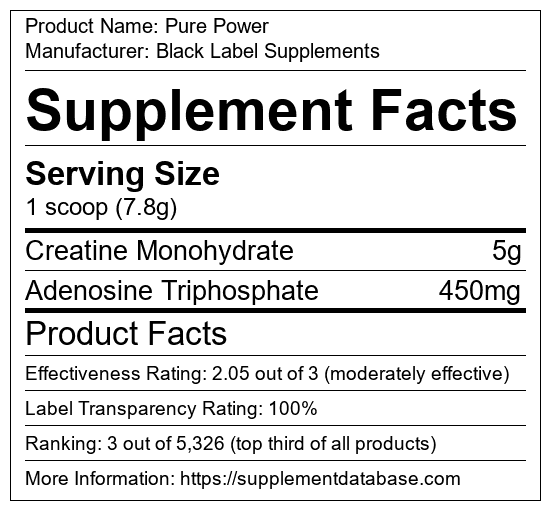 Pure Power is a pre-workout supplement manufactured by Black Label Supplements. It ranks 2 out of 1,898 pre-workout supplements and earned an overall thumbs-up recommendation based on seven factors including nutrition label transparency, ingredients, dosing, claims, research rating, and ranking.