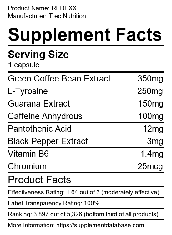 REDEXX is a fat burning supplement manufactured by Trec Nutrition. It ranks 517 out of 719 fat burning supplements and earned an overall thumbs-down recommendation based on seven factors including nutrition label transparency, ingredients, dosing, claims, research rating, and ranking.