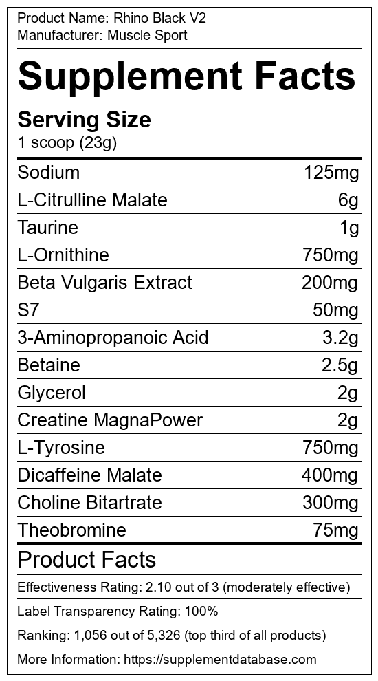 Rhino Black V2 is a pre-workout supplement manufactured by Muscle Sport. It ranks 469 out of 1,898 pre-workout supplements and earned an overall thumbs-up recommendation based on seven factors including nutrition label transparency, ingredients, dosing, claims, research rating, and ranking.
