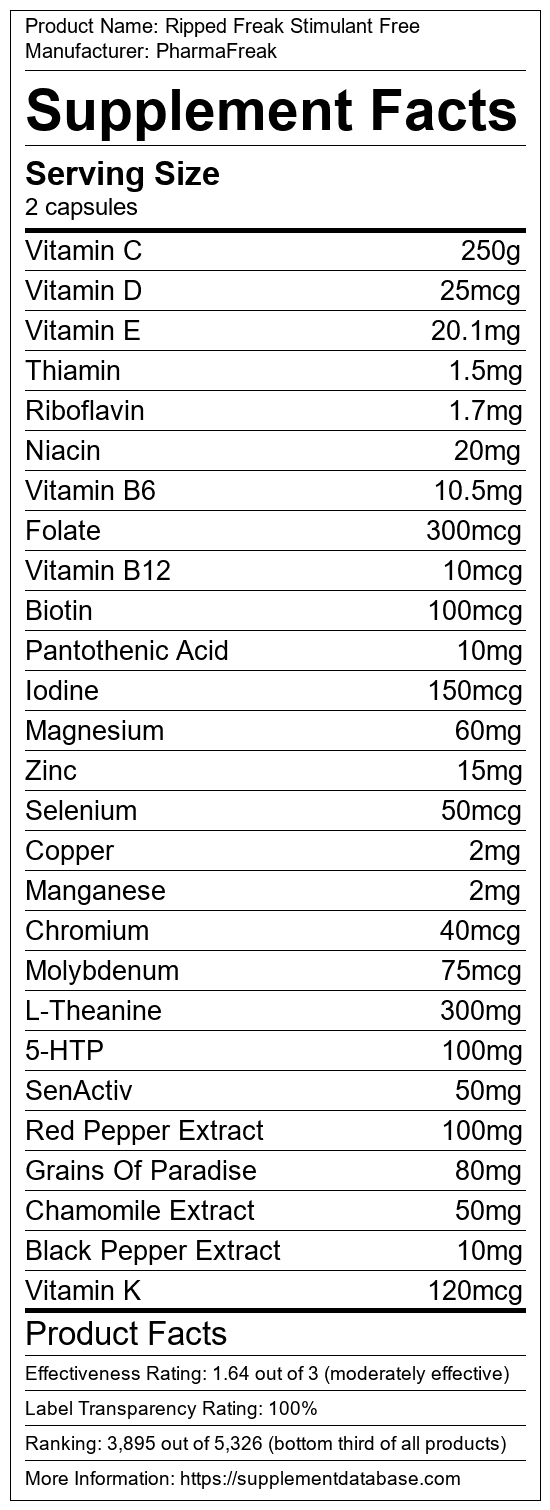 Ripped Freak Stimulant Free is a fat burning supplement manufactured by PharmaFreak. It ranks 516 out of 719 fat burning supplements and earned an overall thumbs-down recommendation based on seven factors including nutrition label transparency, ingredients, dosing, claims, research rating, and ranking.