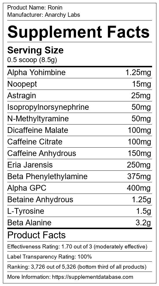 Ronin is a pre-workout supplement manufactured by Anarchy Labs. It ranks 1,512 out of 1,898 pre-workout supplements and earned an overall thumbs-down recommendation based on seven factors including nutrition label transparency, ingredients, dosing, claims, research rating, and ranking.