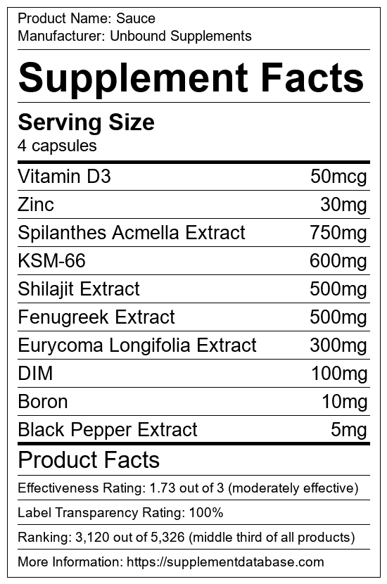 Sauce is a testosterone booster manufactured by Unbound Supplements. It ranks 162 out of 321 testosterone boosters and earned an overall thumbs-down recommendation based on seven factors including nutrition label transparency, ingredients, dosing, claims, research rating, and ranking.