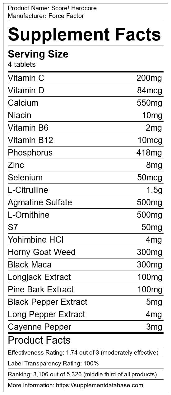 Score! Hardcore is a male enhancement supplement manufactured by Force Factor. It ranks 15 out of 35 male enhancement supplements and earned an overall thumbs-down recommendation based on seven factors including nutrition label transparency, ingredients, dosing, claims, research rating, and ranking.