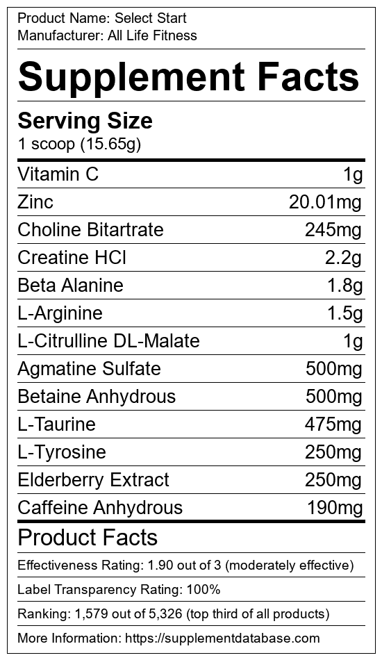 Select Start is a pre-workout supplement manufactured by All Life Fitness. It ranks 701 out of 1,898 pre-workout supplements and earned an overall thumbs-up recommendation based on seven factors including nutrition label transparency, ingredients, dosing, claims, research rating, and ranking.