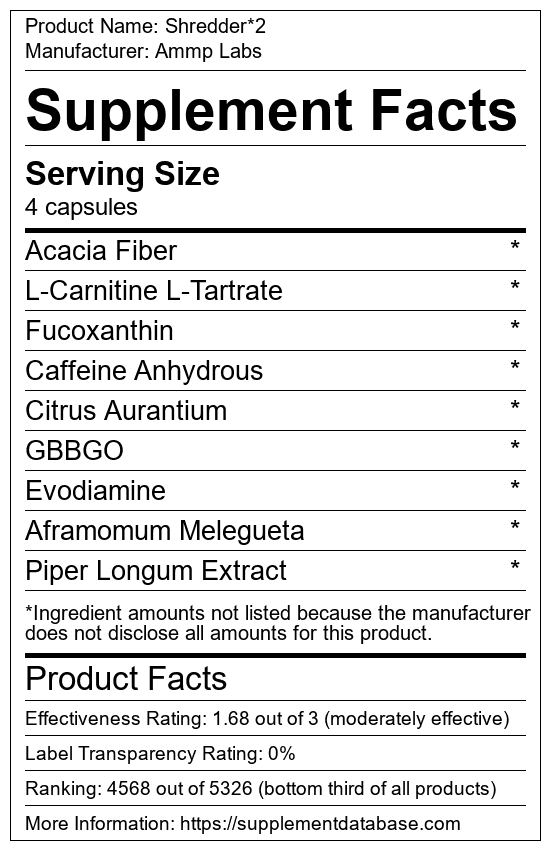 Shredder is a fat burning supplement manufactured by Ammp Labs. It ranks 647 out of 719 fat burning supplements and earned an overall thumbs-down recommendation based on seven factors including nutrition label transparency, ingredients, dosing, claims, research rating, and ranking.