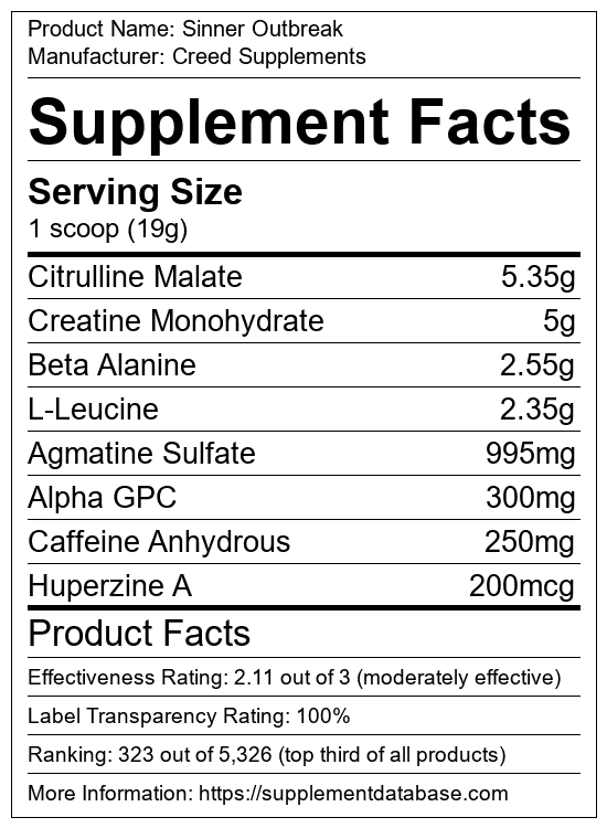 Sinner Outbreak is a pre-workout supplement manufactured by Creed Supplements. It ranks 134 out of 1,898 pre-workout supplements and earned an overall thumbs-up recommendation based on seven factors including nutrition label transparency, ingredients, dosing, claims, research rating, and ranking.