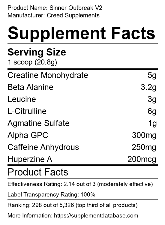 Sinner Outbreak V2 is a pre-workout supplement manufactured by Creed Supplements. It ranks 123 out of 1,898 pre-workout supplements and earned an overall thumbs-up recommendation based on seven factors including nutrition label transparency, ingredients, dosing, claims, research rating, and ranking.