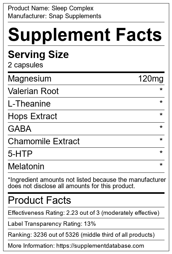 Sleep Complex is a sleep aid manufactured by Snap Supplements. It ranks 150 out of 215 sleep aids and earned an overall thumbs-down recommendation based on seven factors including nutrition label transparency, ingredients, dosing, claims, research rating, and ranking.