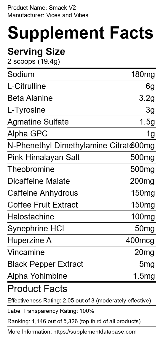 Smack V2 is a pre-workout supplement manufactured by Vices and Vibes. It ranks 511 out of 1,898 pre-workout supplements and earned an overall thumbs-up recommendation based on seven factors including nutrition label transparency, ingredients, dosing, claims, research rating, and ranking.