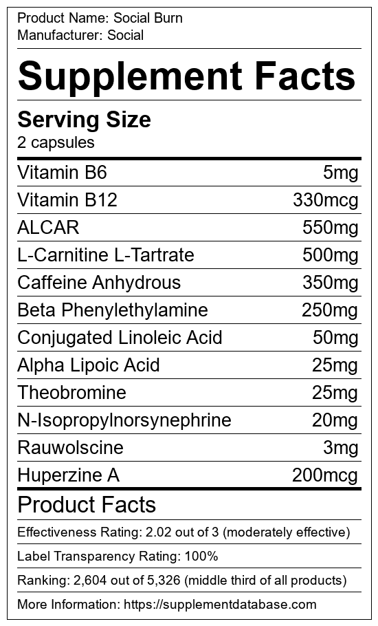 Social Burn is a fat burning supplement manufactured by Social. It ranks 289 out of 719 fat burning supplements and earned an overall thumbs-down recommendation based on seven factors including nutrition label transparency, ingredients, dosing, claims, research rating, and ranking.