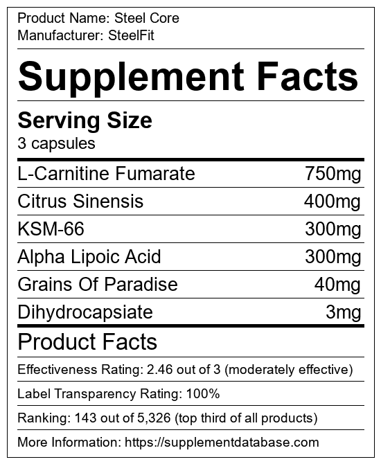 Steel Core is a fat burning supplement manufactured by SteelFit. It ranks 6 out of 719 fat burning supplements and earned an overall thumbs-up recommendation based on seven factors including nutrition label transparency, ingredients, dosing, claims, research rating, and ranking.